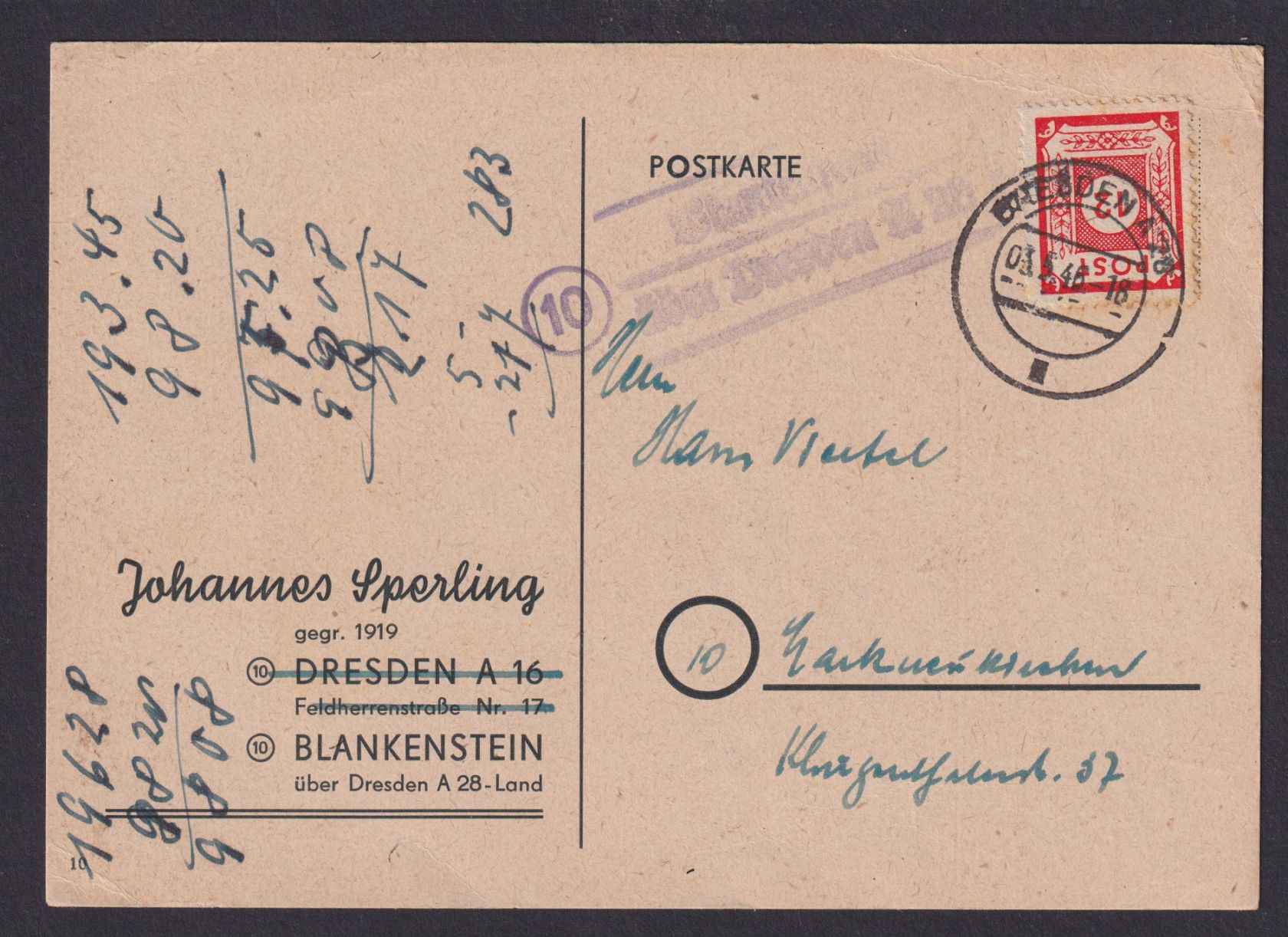 SBZ Landpoststempel Blankenstein über Dresden auf Postkarte EF 12 Pfg. 3.5.1946