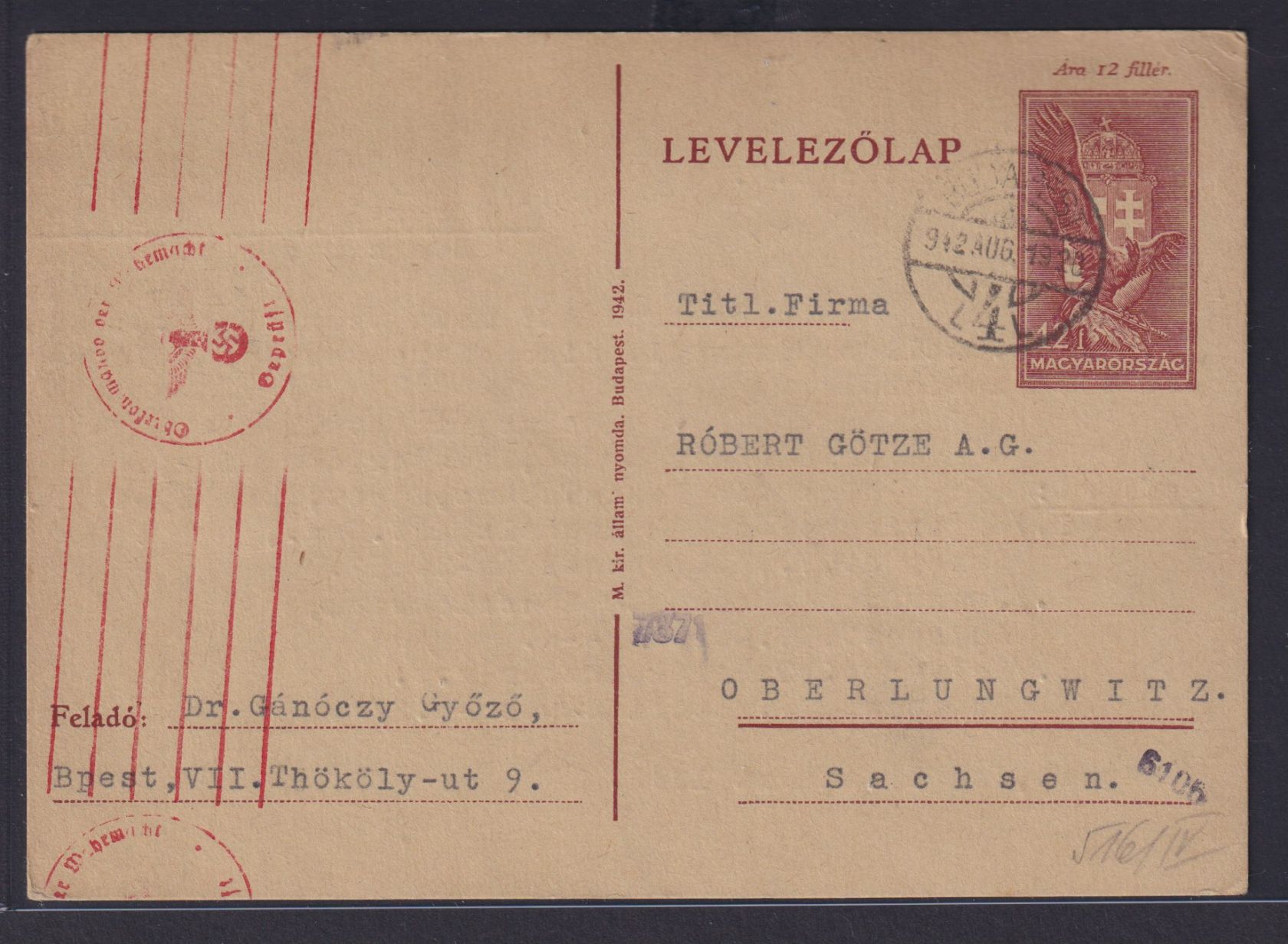 Ungarn Zensur Ganzsache GSK 12 f Sagenvogel Turul Wappen Oberlungwitz Sachsen
