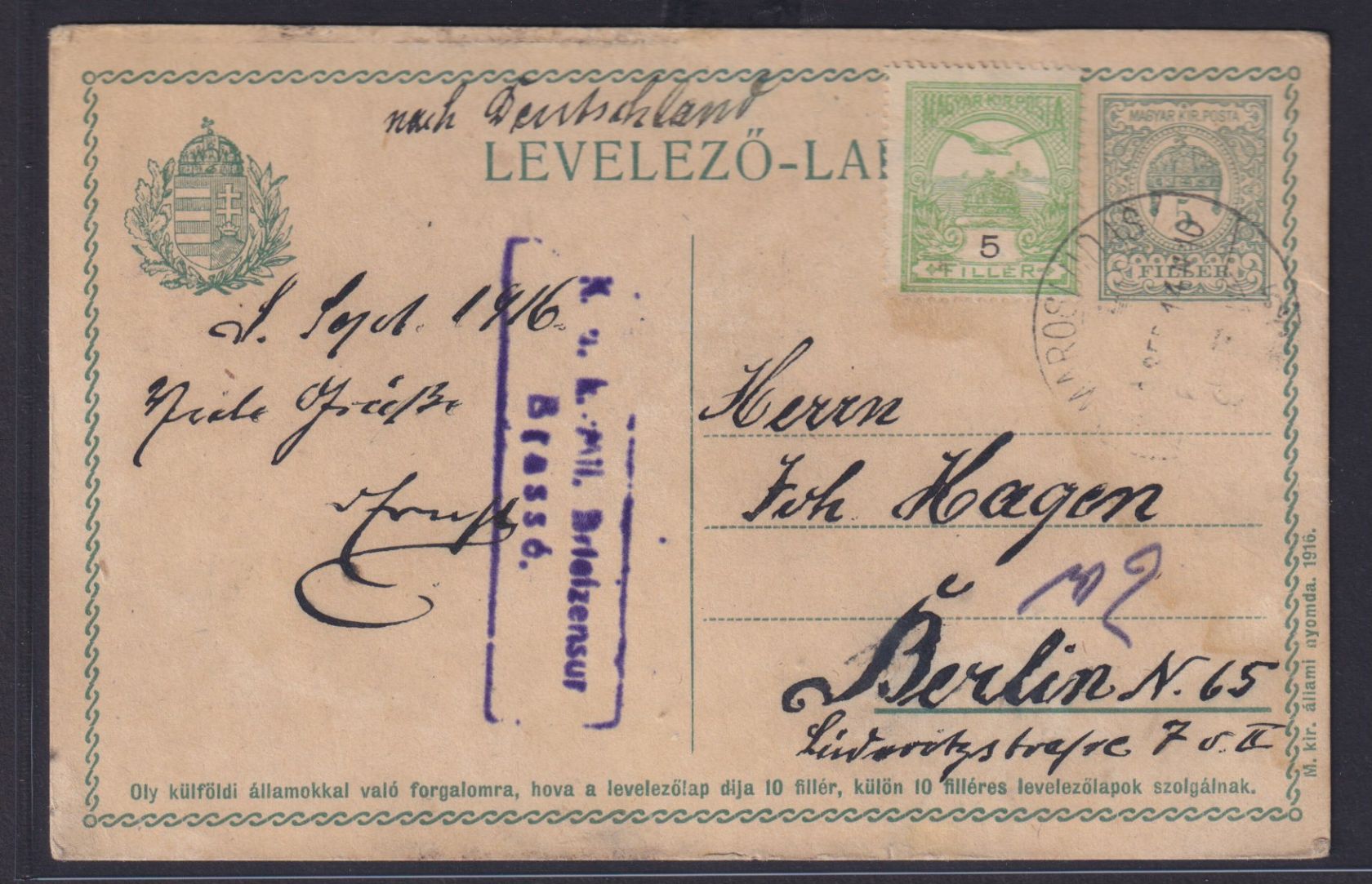 Zensur Ungarn Ganzsache GSK 2 Fi + ZuF Kreuzer nach Berlin viol. R2 K.u.k.