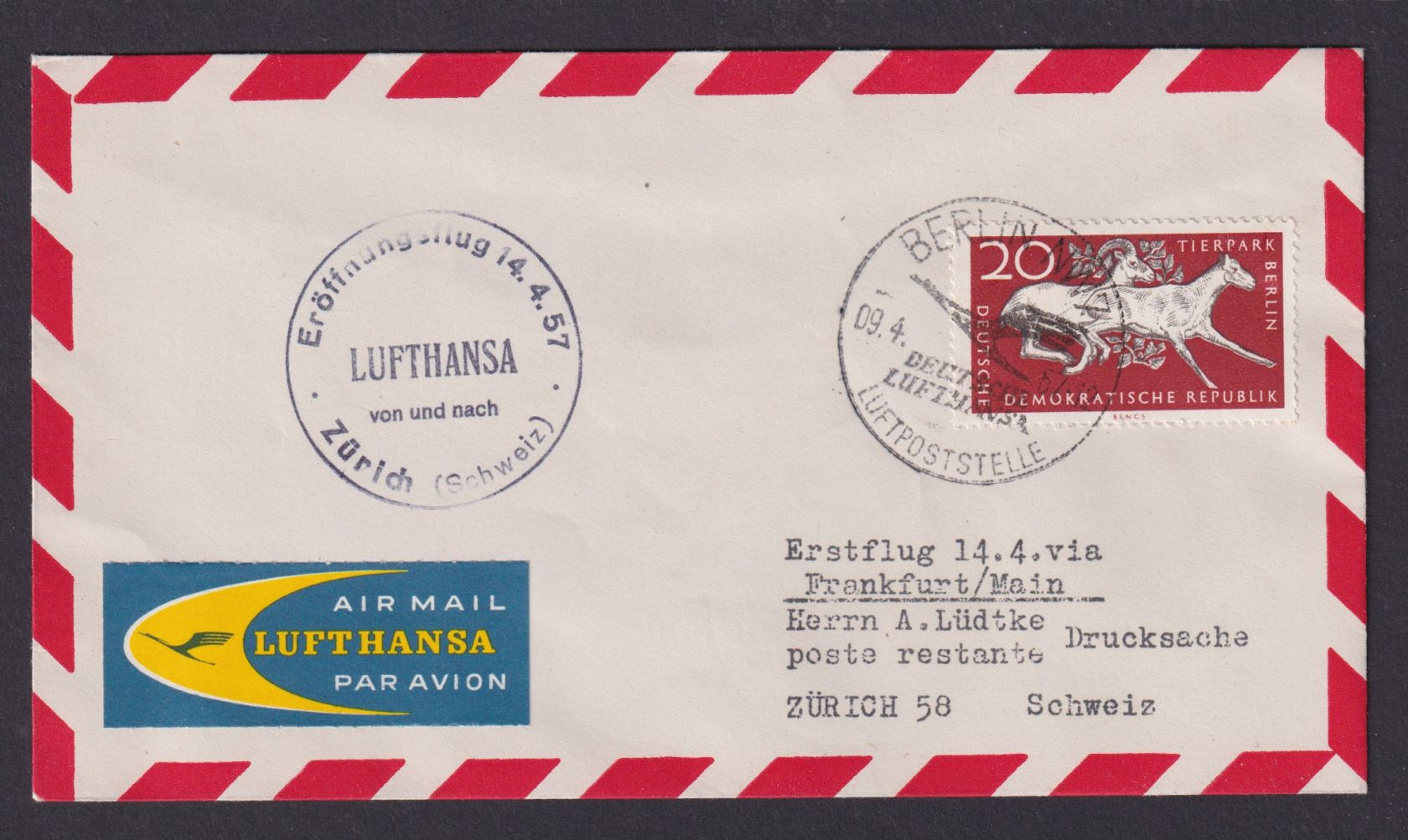 Flugpost Brief Air Mail Berlin Frankfurt Zürich Schweiz Erstflug Lufthansa 1957