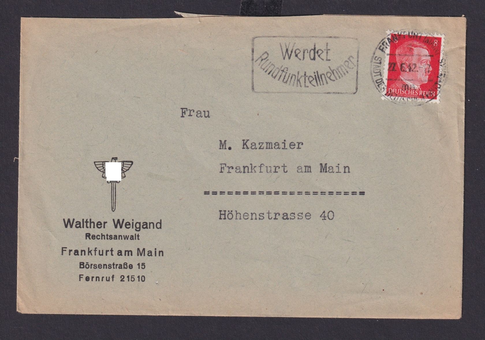 teilnehmer n. Frankfurt Vordruck Reklame Brief Mit Hakenkreuz und Schwert Rechtsanwalt Weiganhd 27.06.1942