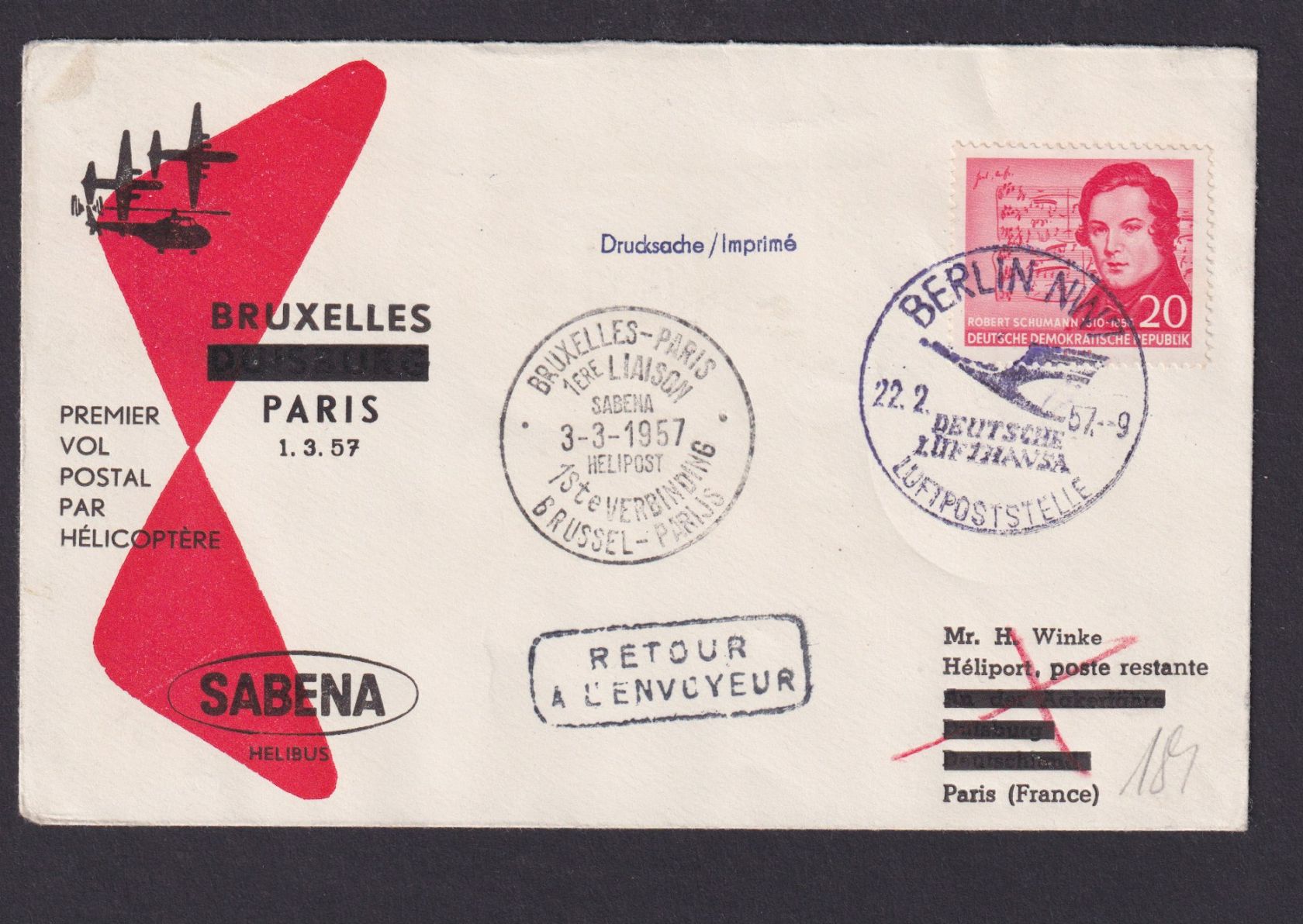 Helikopter Flugpost Brief Sabena Helibus Brüssel Paris selt DDR Zuleitung Berlin