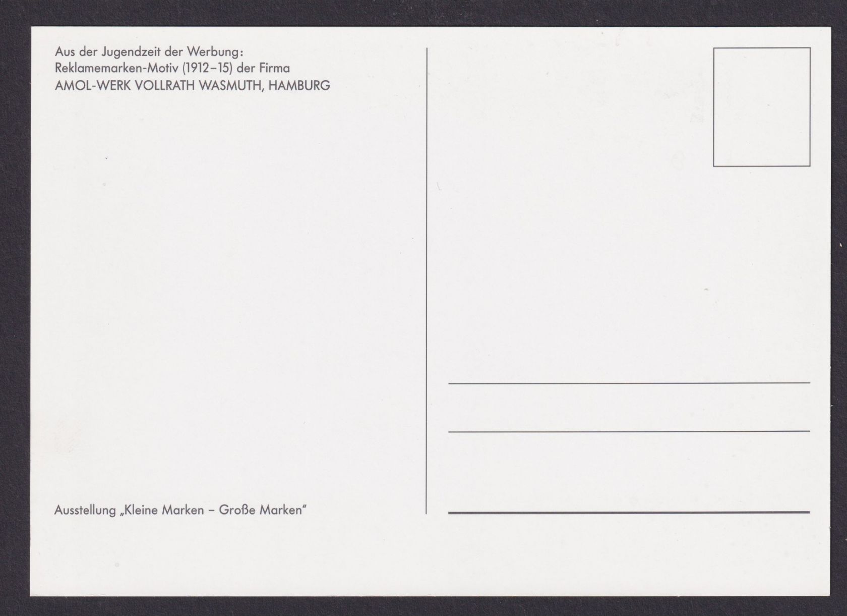 Vollrath Wasmuth Hamburg Aus der Jugendzeit der Werbung 1912 bis 1915.Kunst Grafik Gebrauchsgrafik . Diese wunderschöne Reprint Karte wurde auf der Reklame-Ausstellung Kleine Marken-Große Marken im Jahr 2000 in der Rathaus Galerie München verkauft.