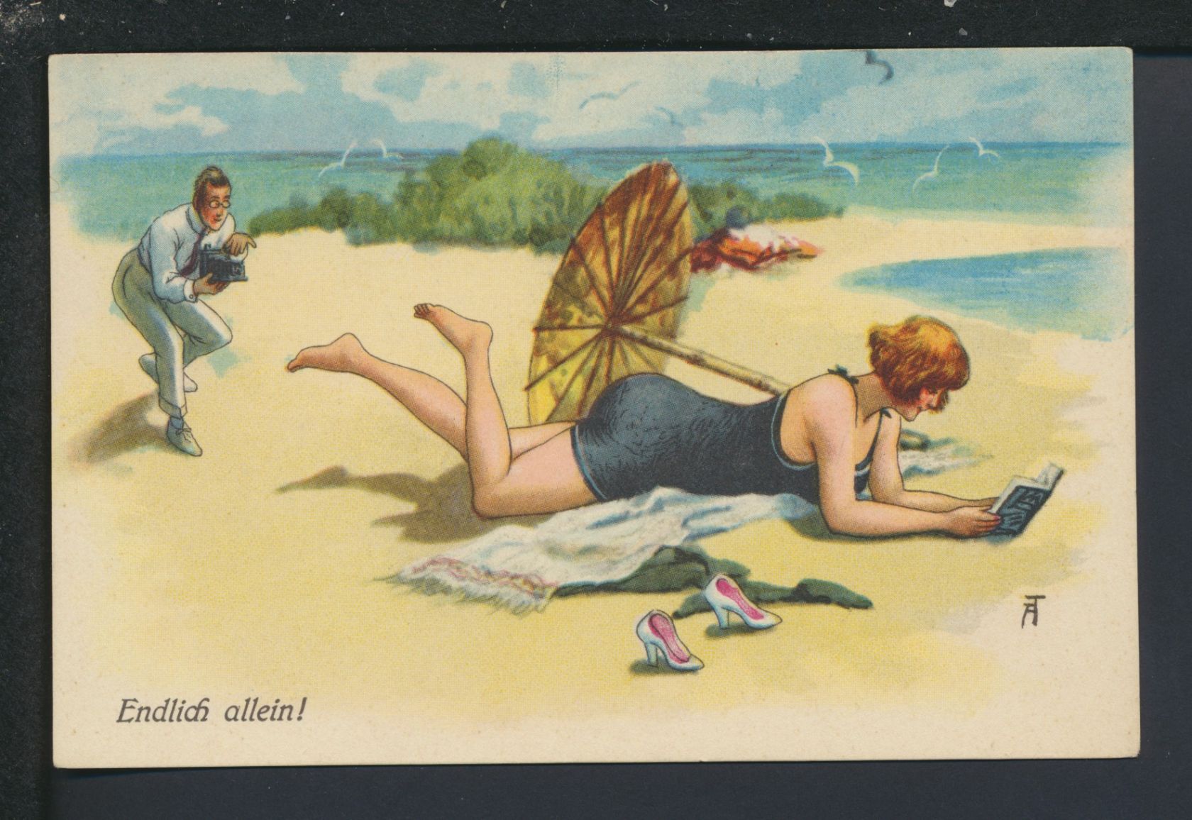 Künstler Ansichtskarte sign AT Artur Thiele ? Endlich allein Humor im Bade