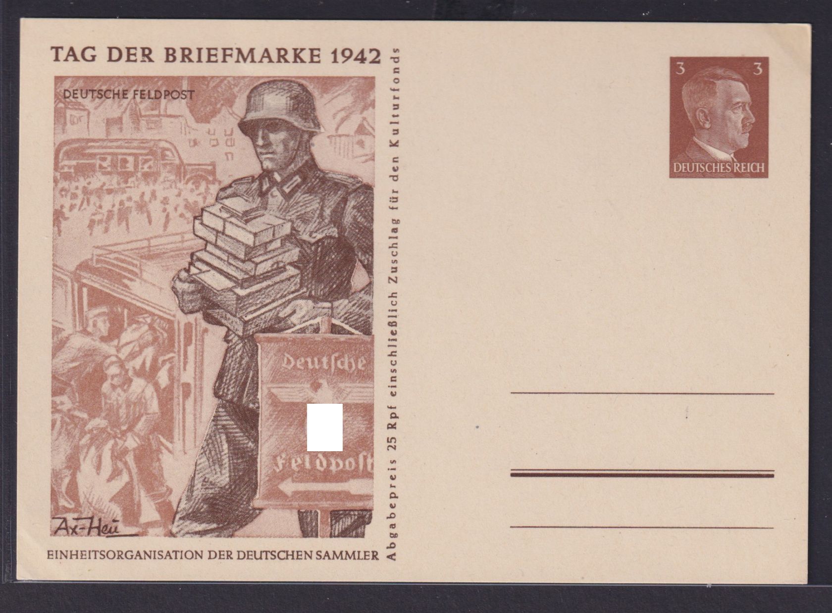 Tag der Briefmarke Philatelie Künstler Karte sign. Ax-Heu Feldpost Soldat Zuschalg für den Kulturfonds 1942.