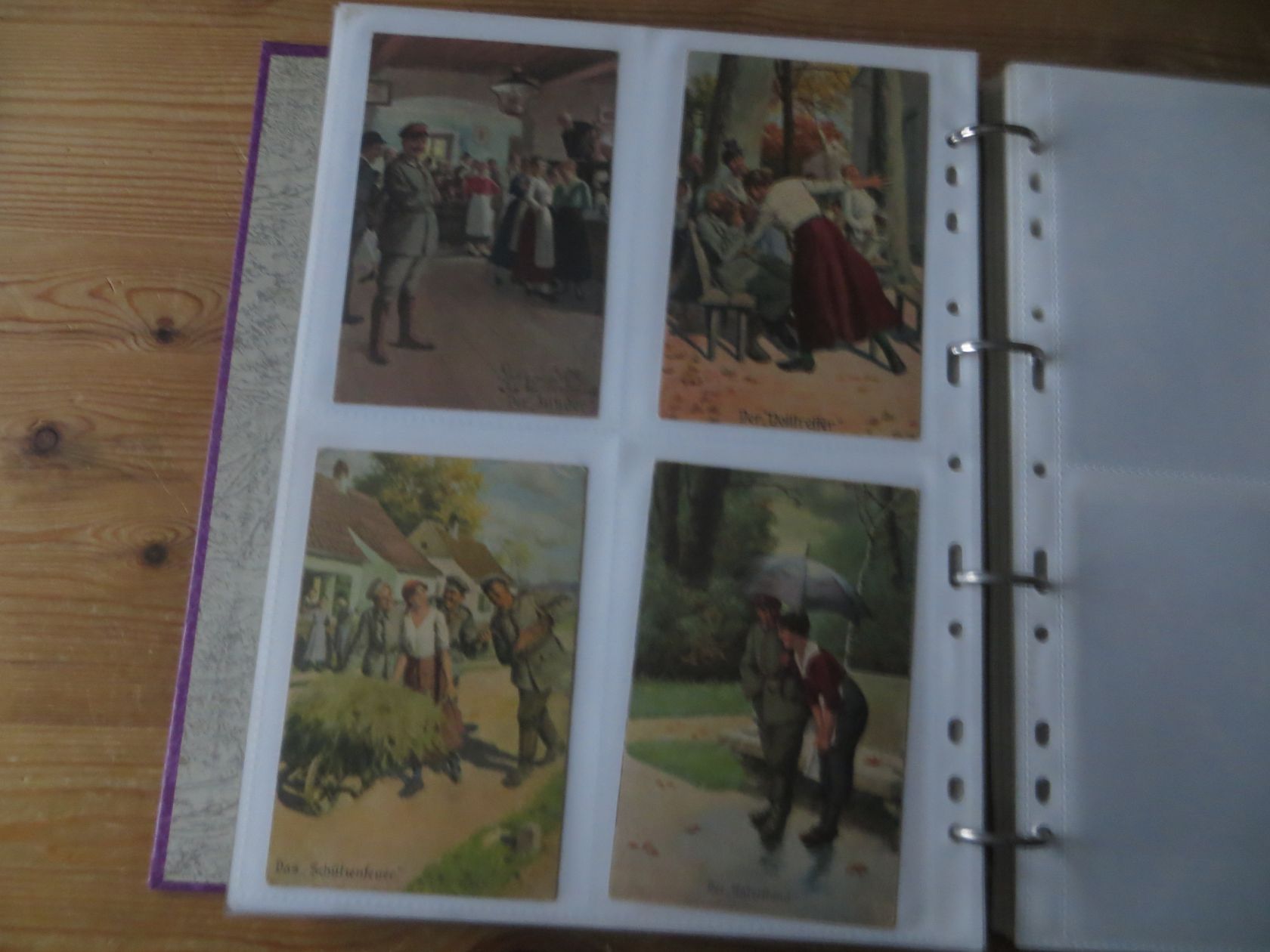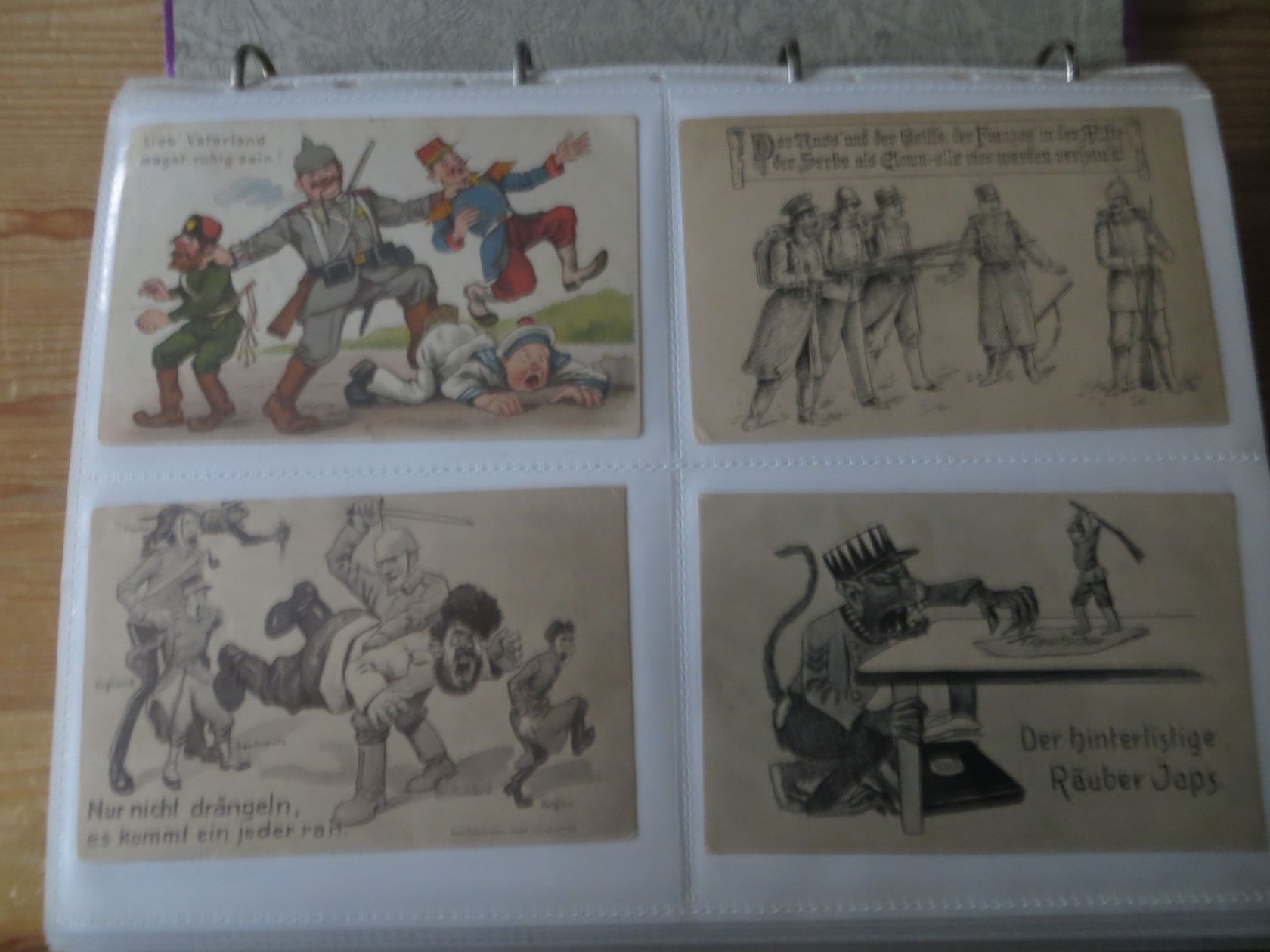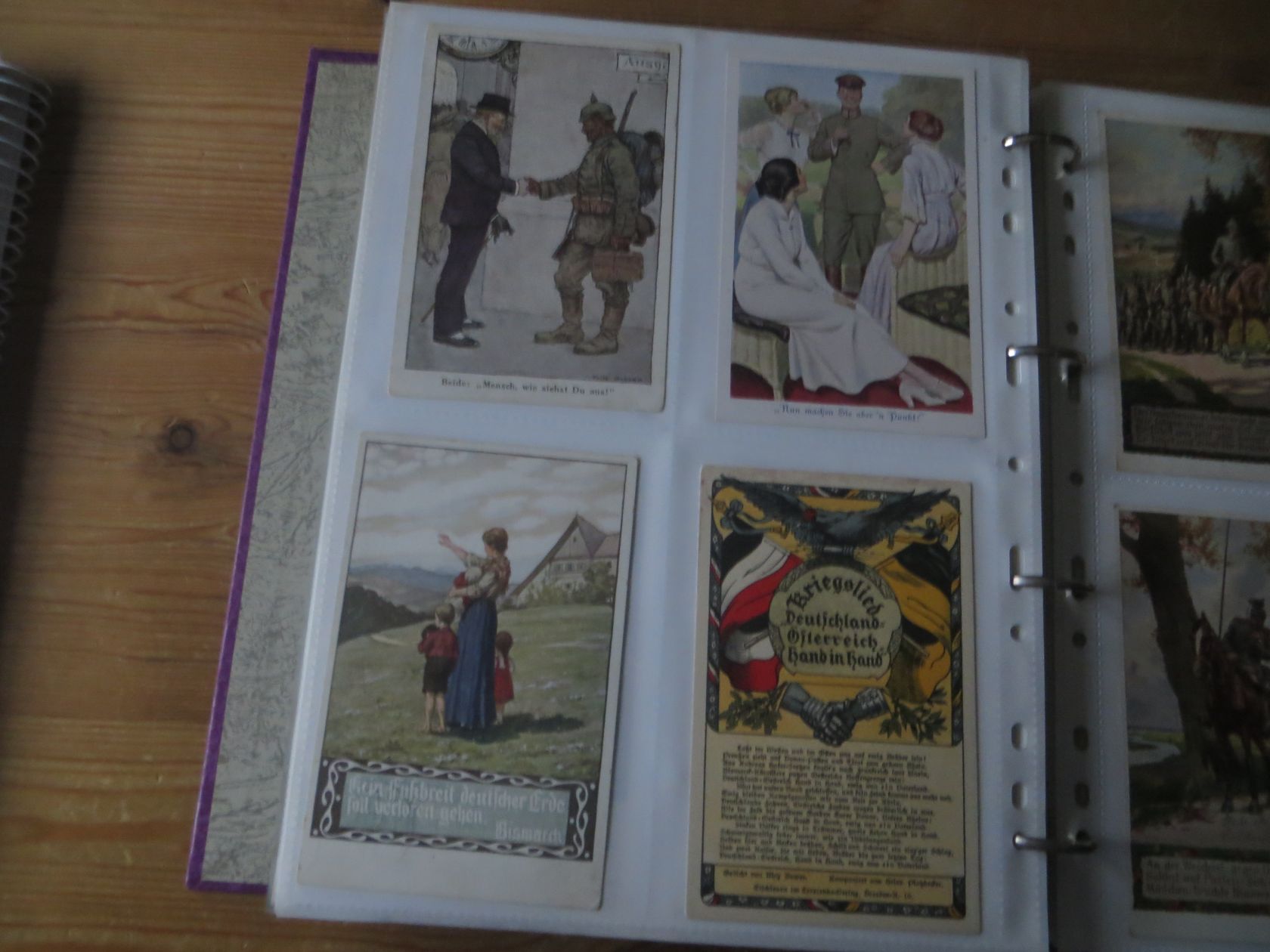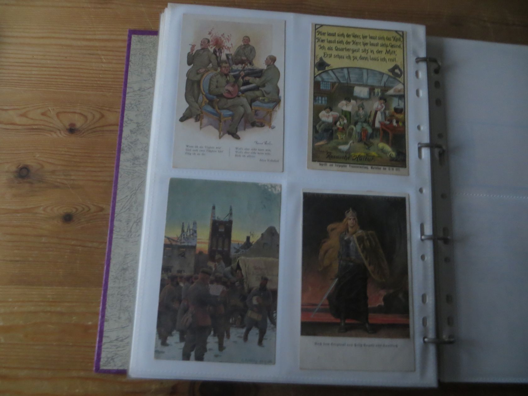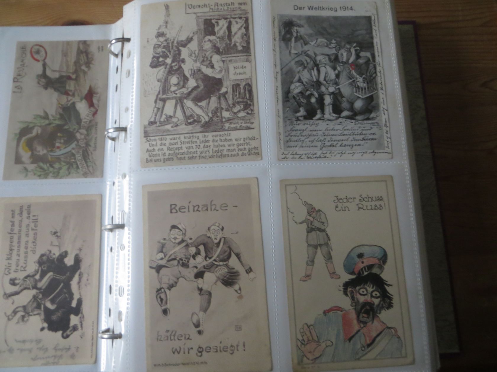 und div. Thematik, mit sehr vielen signierten Künstler - Karten, starke Propaganda auch Anti Russland, meist tolle Farbkarten, und auch Lithos, natürlich viel Feldpost und sicher in diesem Bereich Stempel - Fundgrube, eine tolle Serie Karten aus Frankreich in ungewöhnlich schöner Farbgestaltung handcoloriert !- dann auch etwas Humor, schöne Serie signiert B.W. Brynolf Wennerberg Kriegspostkarten mit alleine 28 Karten, Karten von Paul Hey, Karten Ludendorf Spende, und Kriegsanleihe, und vieles andere mehr! Schönes, interessantes und ansprechendes Objekt, mit geschichtlichen Hintergurnd, mit wohl nur ausgesuchten Karten. Nicht die übliche Masse! Ein immer wieder schönes und gesuchtes Sammelgebiet. Und in sehr guter Gesamterhaltung! Ideal zum Auflösen!