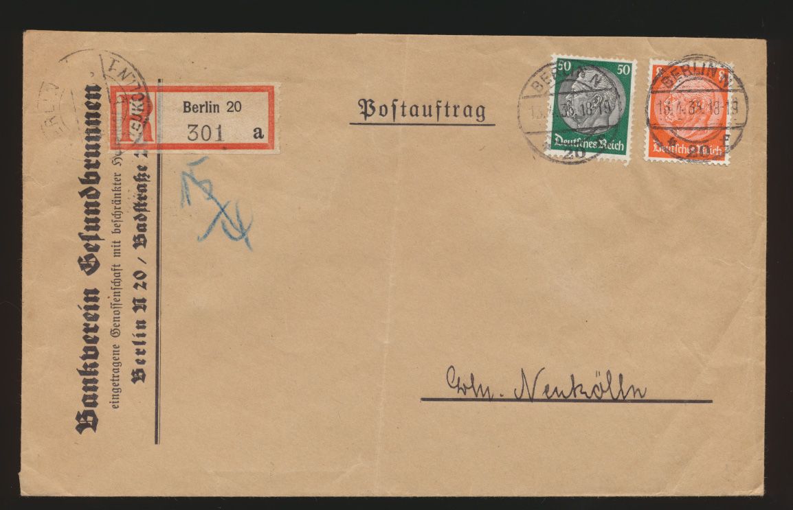 Postsache D. Reich R Brief MIF Hindenburg Postauftrag Berlin nach Neukölln Wachs