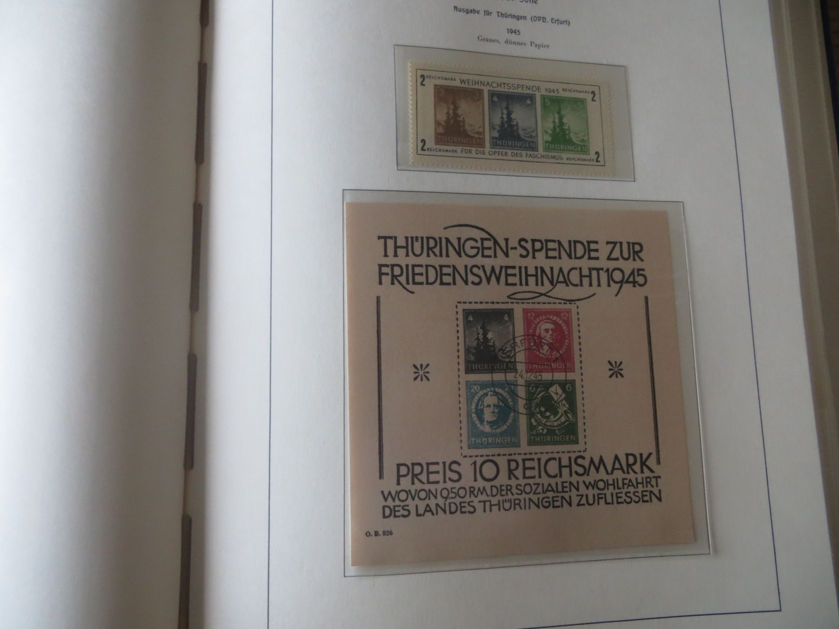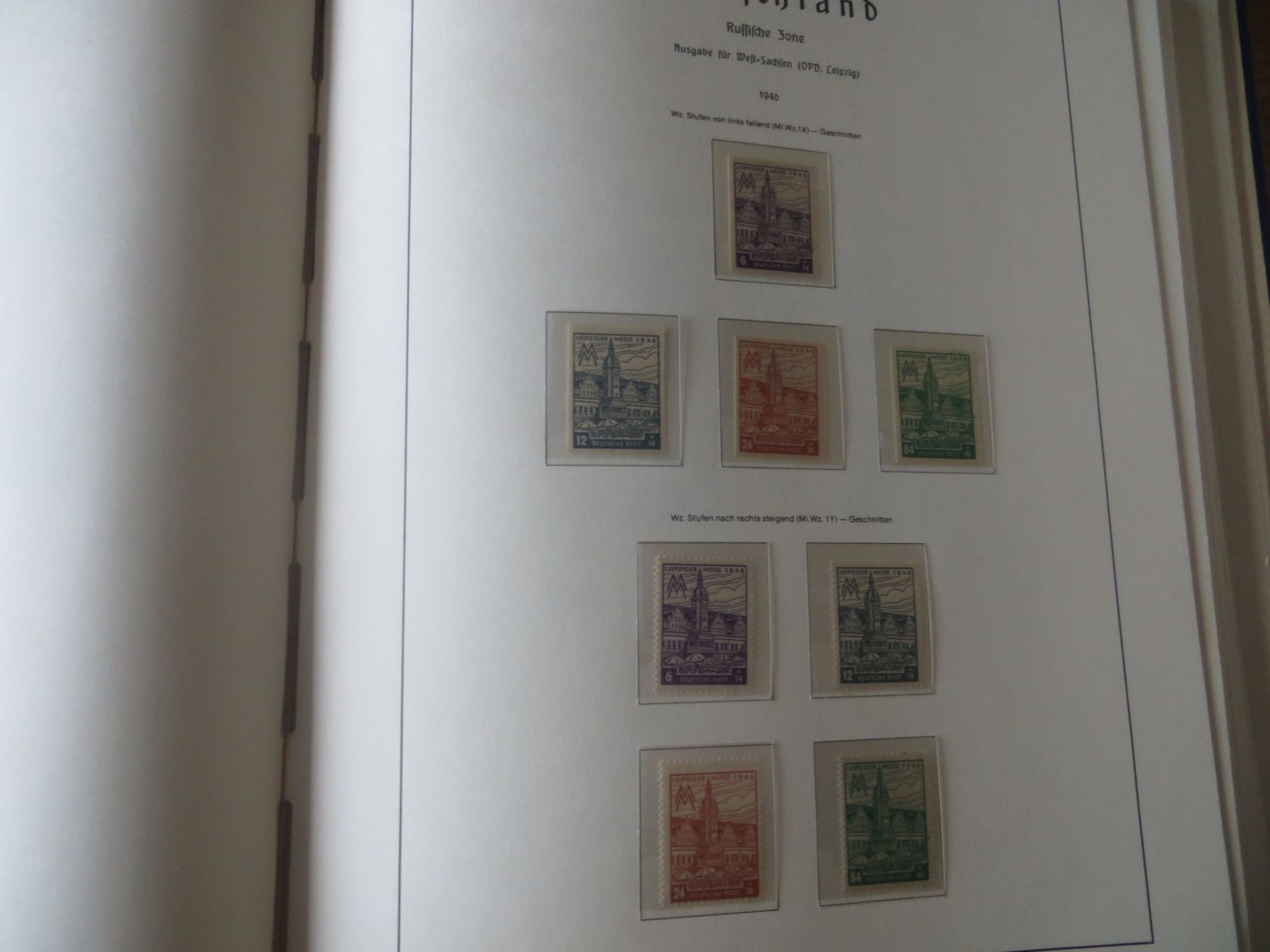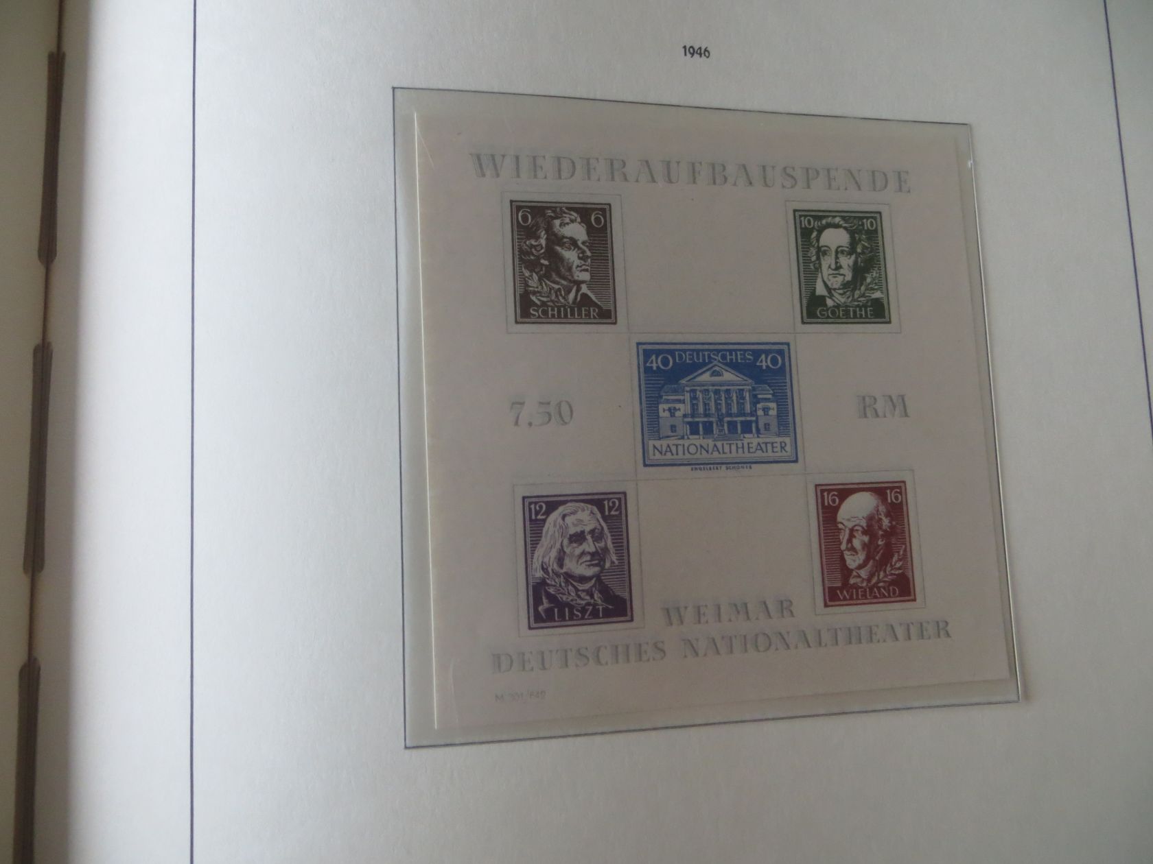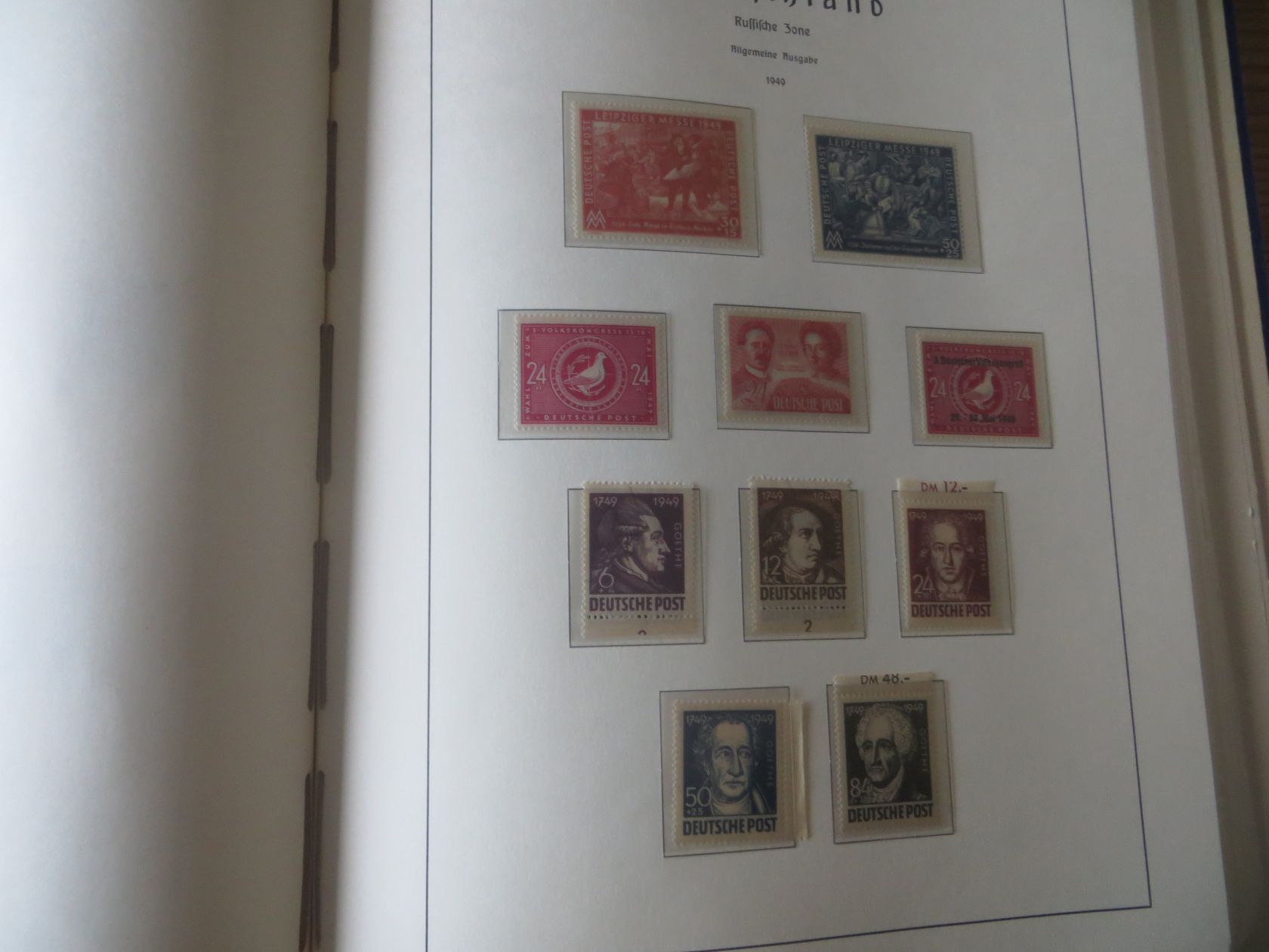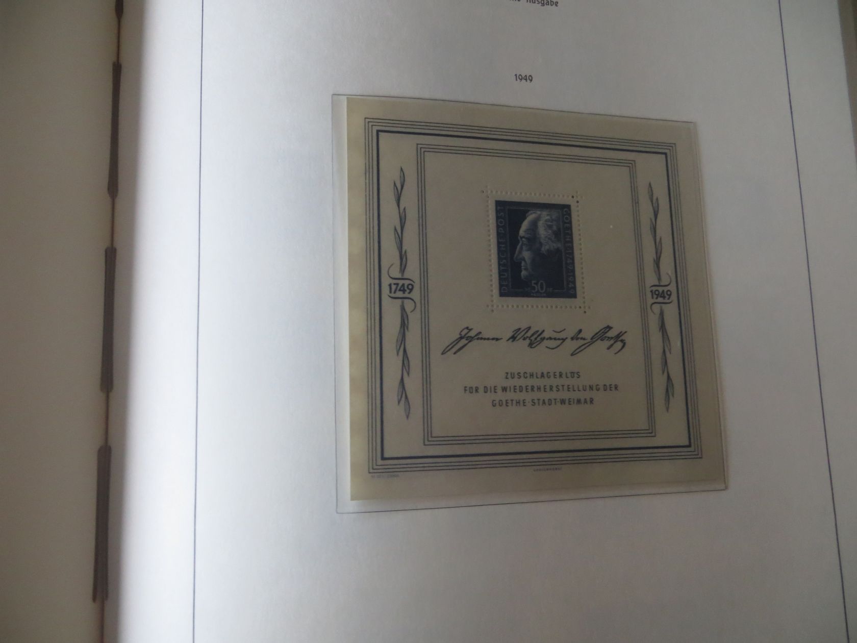 viele gute Ausgaben und Blöcke, bis zum Goethe-Block! Der Weihnachts-Block kann nicht gewertet werden. In den Hauptnummern wohl bis auf 2-3 Werte komplett, aber !!!! dazu noch sehr viele Besonderheiten auf den Vordrucken, und auf Sonderseiten, Farben und Zähnungswarianten! Alles im Leuchtturm-Falzlos Album. Dazu noch außerdem ein Blattsatz meist ohne Taschen. Sehr hoher Kat.Wert!!! Alles im neuwertigen, blauem Leuchturm Binder incl. Schuber! Ein sehr empfehlenswertes tolles Objekt. Der Zubehör Neupreis liegt heute schon bei alleine 210,00 €!