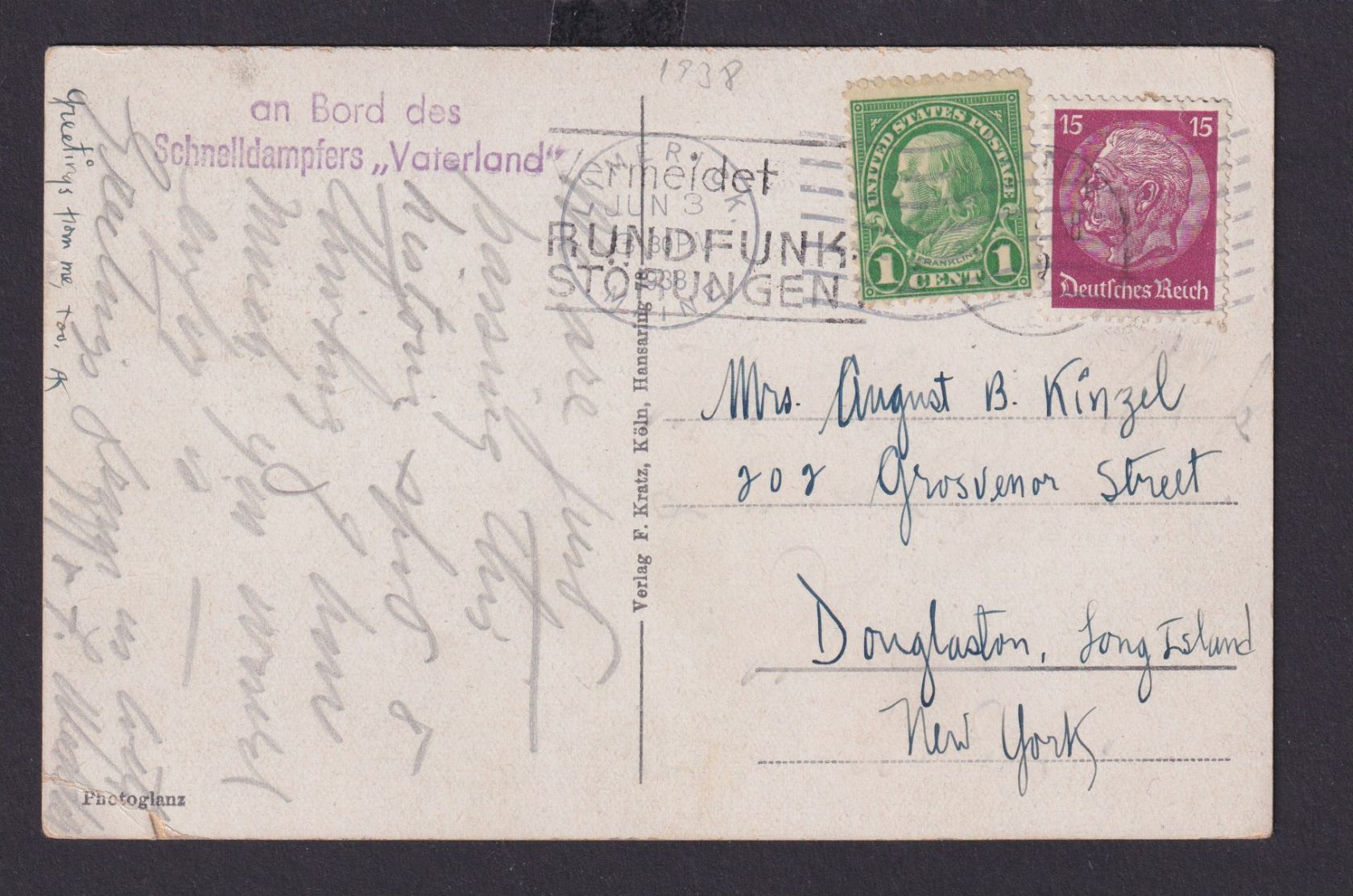 Schiffspost Deutsches reich Schnelldampfer Vaterland n Douglaston Long Island USA
