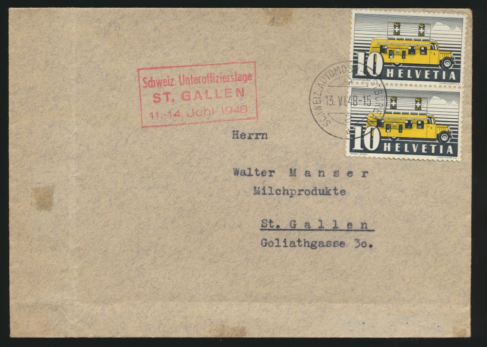 Schweiz Brief MEF Automobil Postbureau + roter R3 Unteroffizierstage St. Gallen