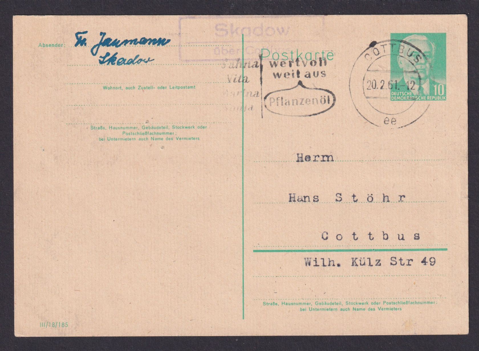 Skadow über Cottbus Landpostempel Cottbus Brandenburg DDR Pieck Ganzsache
