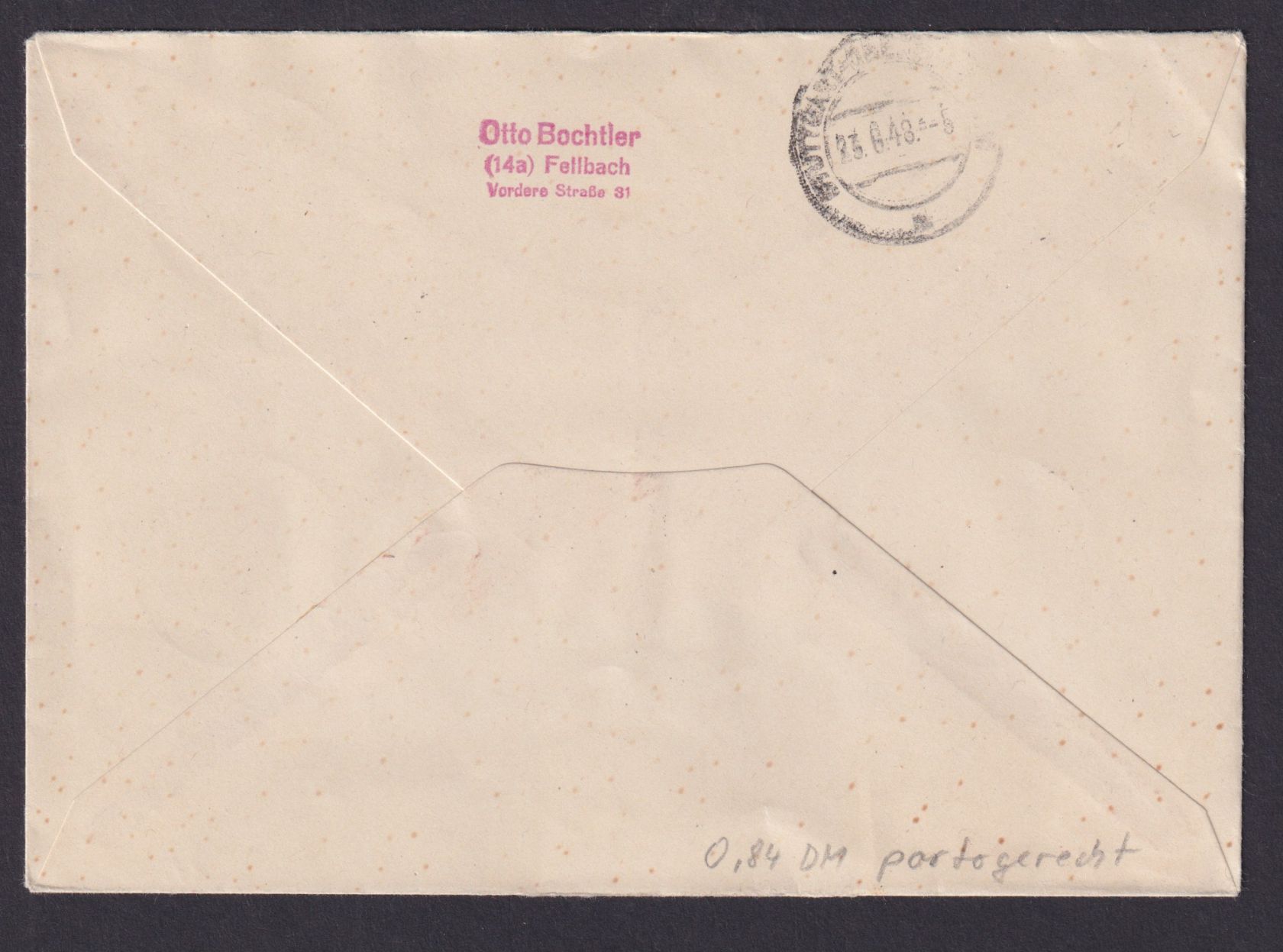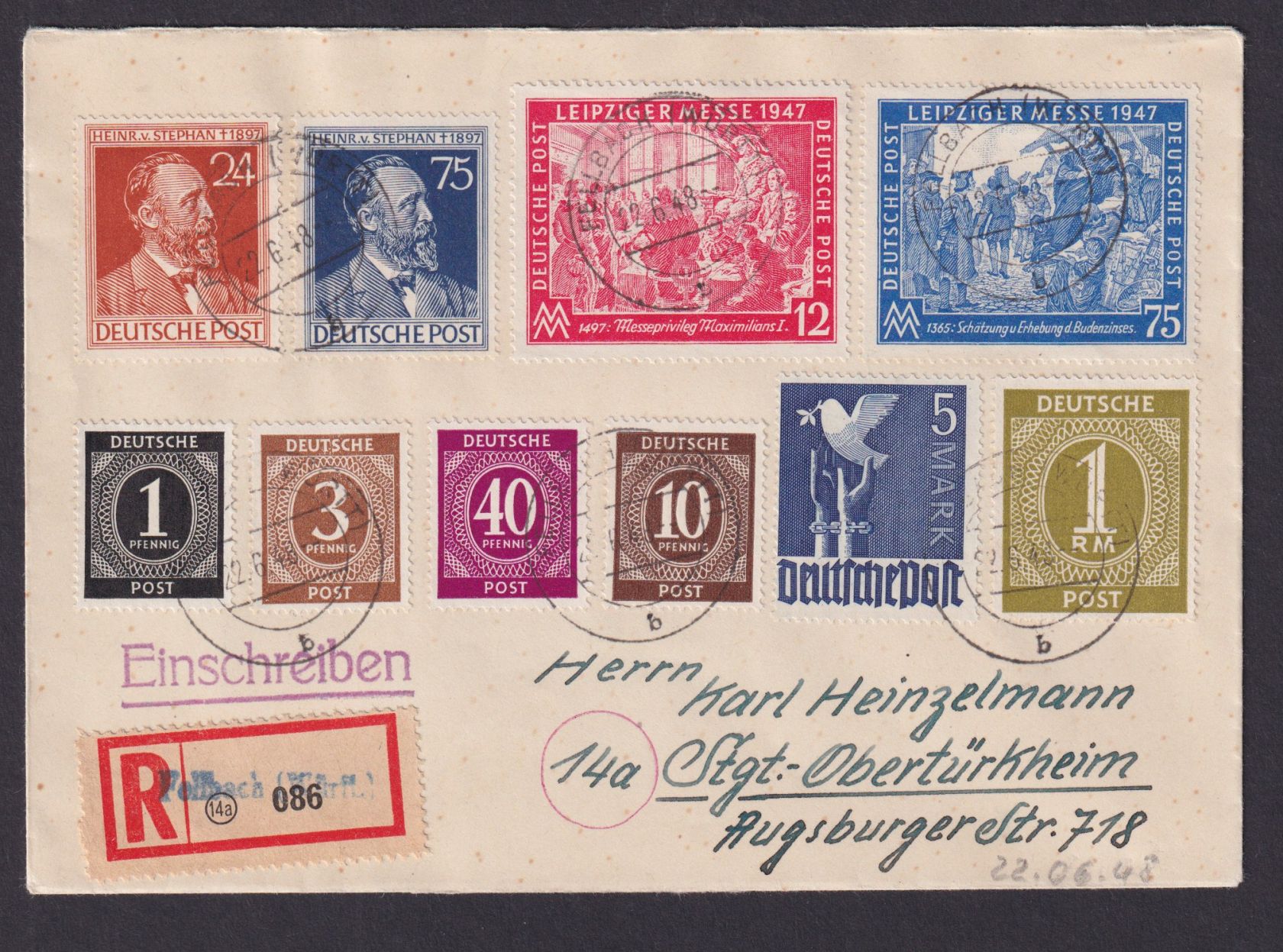 den Tauben und u.a. Stephna UPU Philatelie 22.06.1948. Portogerecht mit 8,40 DM frankiert. Außerdem R Brief mit Not R-Zettel Fellbach Württemberg. Ein exclusiver Beleg auch für I. und II Kontrollrat - Sammlung.